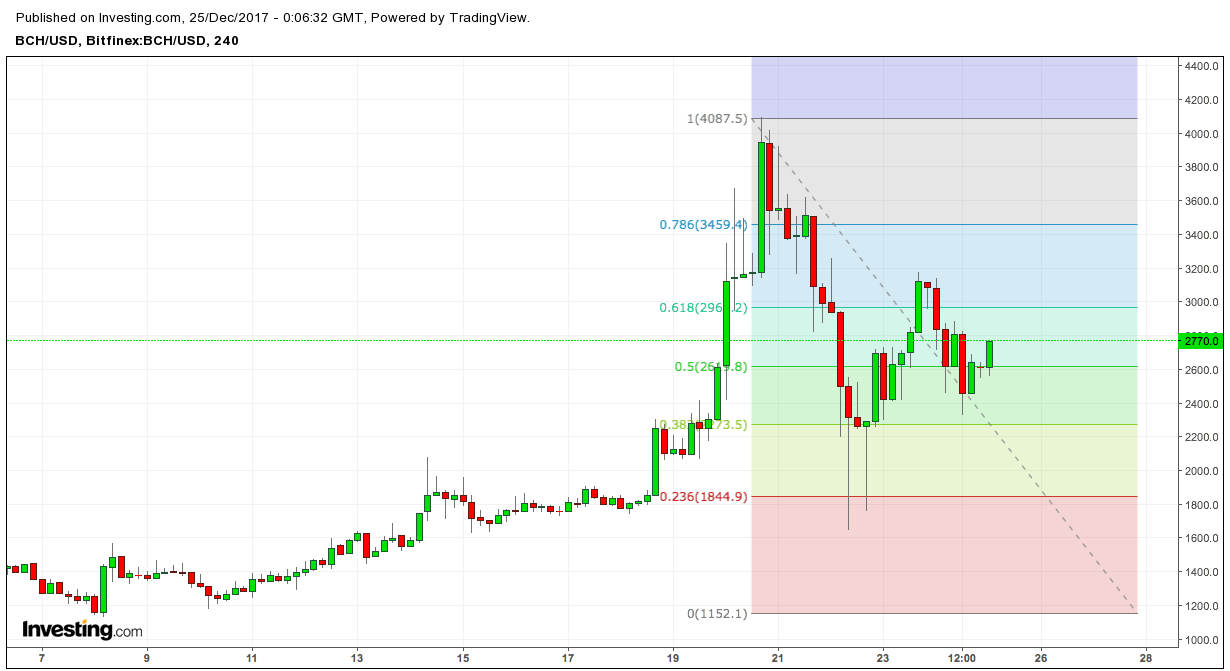 На графике цены BCH/USD видно, как ажиотажный спрос на Bitcoin Cash взвинтил цену почти на 55%, с 1800.00 до 4000.00 долларов США, одновременно с этим цена Bitcoin снизилась с двадцати до тринадцати тысяч.