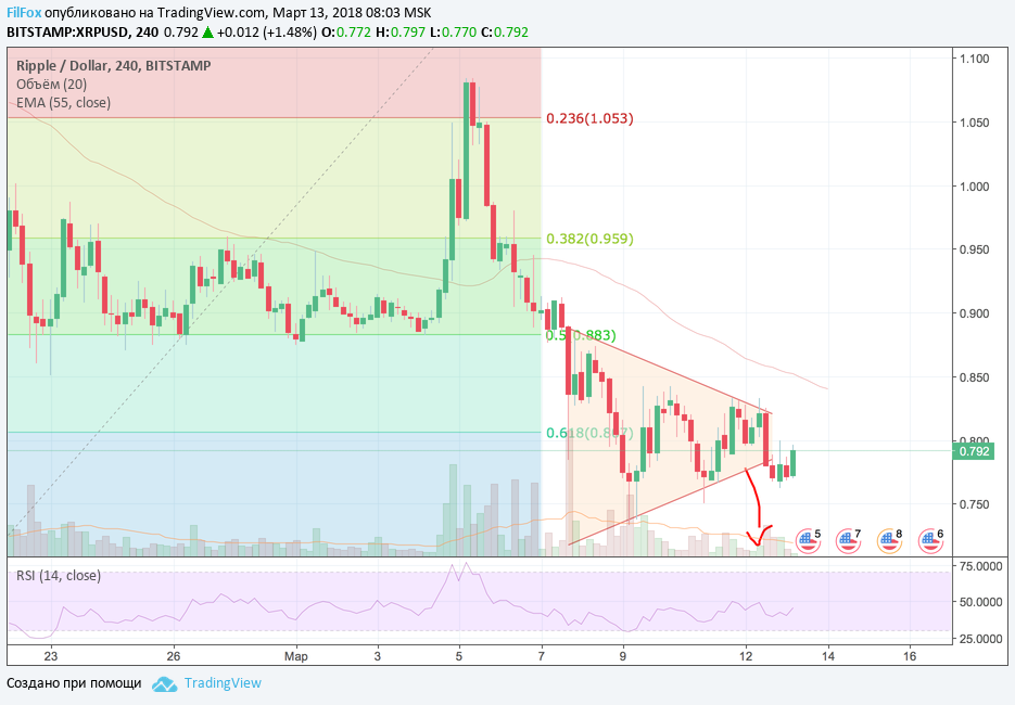 Ripple «вывалился» из сужающегося диапазона консолидации, и на снижении несколько раз, вчера, протестировал нижнюю границу «прямоугольника». Сегодня очередь за ре-тестом верхней границы этого проямоугольника.
