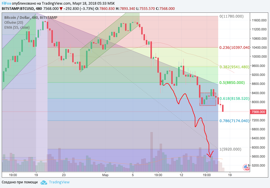 Курс BTC/USD, в первый день этой недели, был достаточно волатильным и продемонстрировал снижение цены более чем на 1100.00 долларов США, установив вечером минимум на отметке 8 742.00 USD. Ещё «суровей» оказалась среда, когда цена за один день обрушилась на 1400.00 долларов. С четверга по субботу цена консолидировалась в диапазоне прямоугольника, тестируя на прочность его верхнюю границу на уровне 8400.00 USD. Сегодня, в воскресенье, цена пробила нижнюю границу прямоугольника на уровне 7830.00 USD, и продолжила снижение к очередному уровню поддержки 78.6% фибоначи (7 174.00 USD).