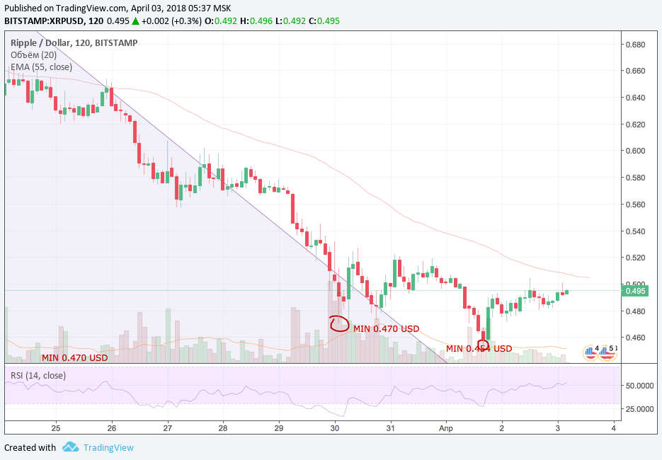 Ripple вчера провёл день в боковом диапазоне. Цена несколько раз протестировала психологический уровень «пятьдесят центов за рипл», установив дневной максимум на отметке 0.504 USD. Устоит ли сегодня апрельский максимум на этой отметке до того, как XRP продолжит снижение пока не ясно. Но для этого цене необходимо преодолеть сопротивление скользящей средней EMA55, которое пробивалось последний раз только 19 марта. Поэтому обновление месячного максимума сегодня маловероятно. Более вероятен ре-тест нижней границы боковика, которая расположена на уровне поддержки 0.450 USD.