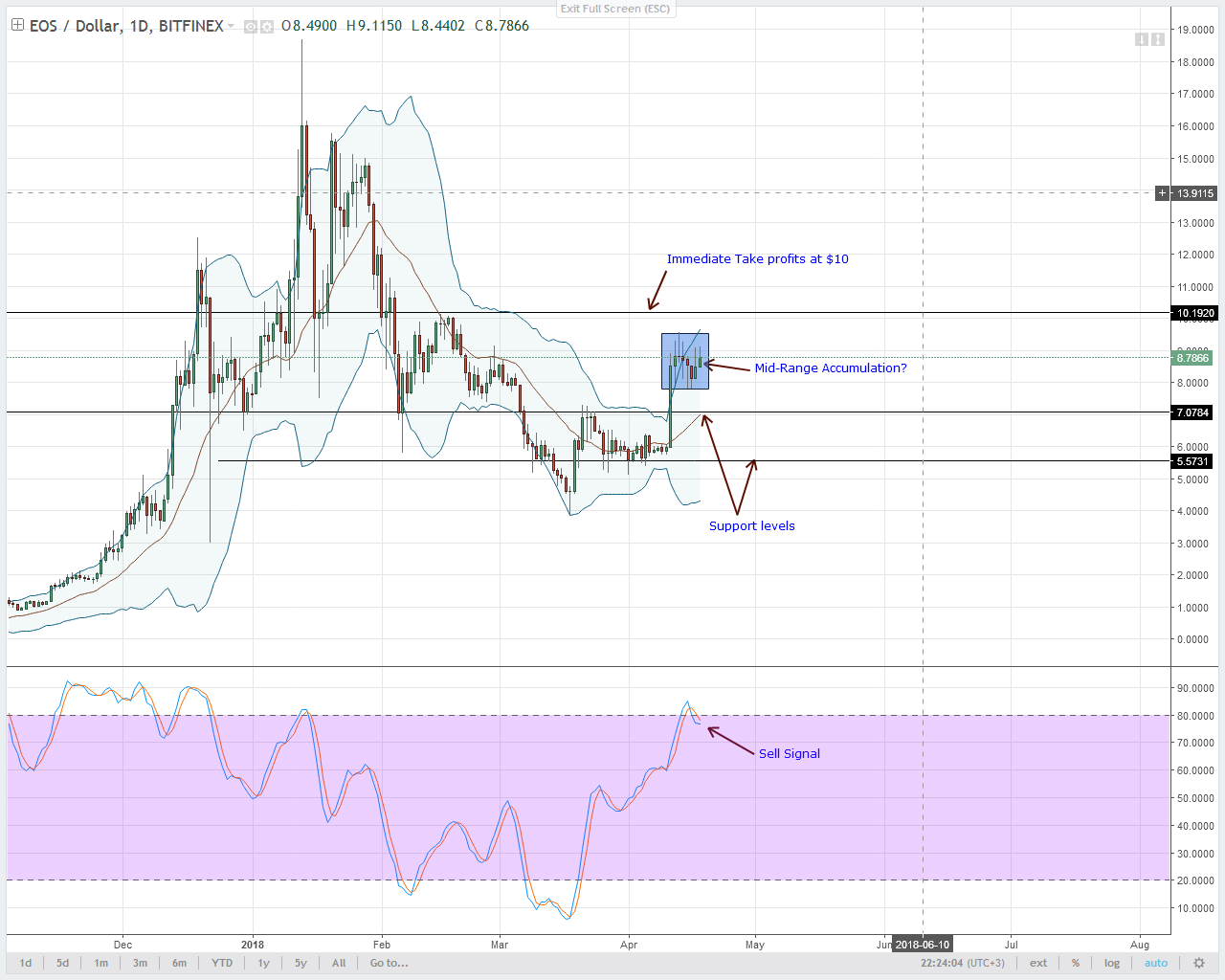 На графиках мы не видим ничего удивительного, ценовой прогноз EOS остается таким же, как и вчера. Мне кажется, что на данный момент происходит хорошо организованный процесс консолидации, и если трейдеры будут покупать на провалах со стопами на отметке $7.5, они могут получить неплохую прибыль. Помните о том, что стохастический сигнал до сих пор медвежий, в другой ситуации при таких условиях я бы рекомендовал подождать, с потенциальными покупками на отметке $10.