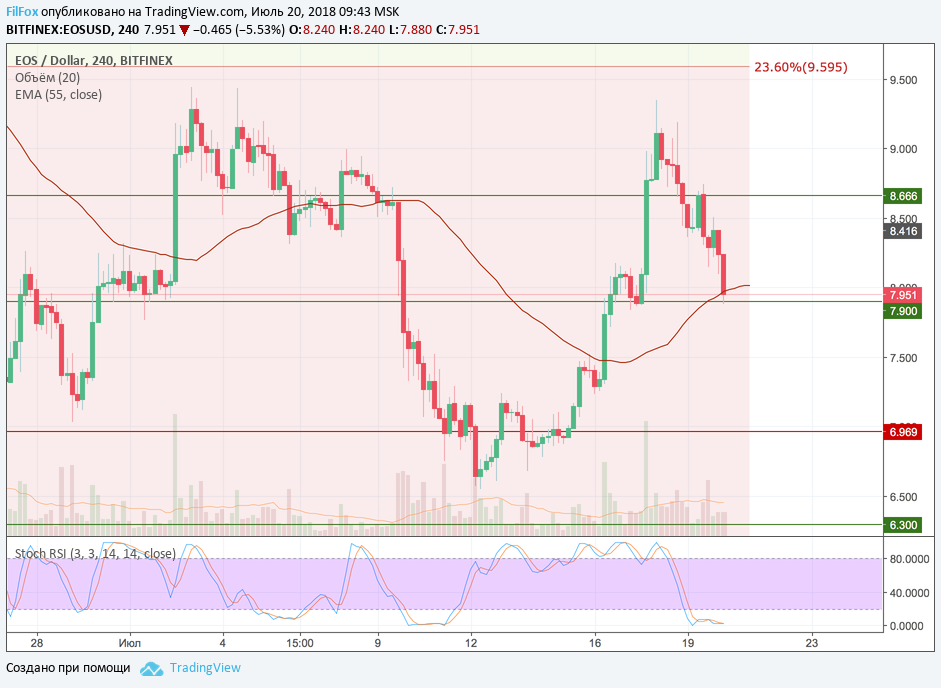 После того, как цена EOS развернулась вчера в точке минимума 8.36 USD, пара смогла восстановиться к уровню 8.666 USD. Но долго удержаться в этой области паре EOS/USD не удалось. Активизация продавцов сбила цену к дневному минимуму 8.15 USD, а сегодня она опустилась ещё ниже и протестировала уровень поддержки 7.90 USD, от которого пара стартовала во вторник. Полагаем, что на этом уровне коррекция закончится и должен произойти разворот цены на восходящий тренд.