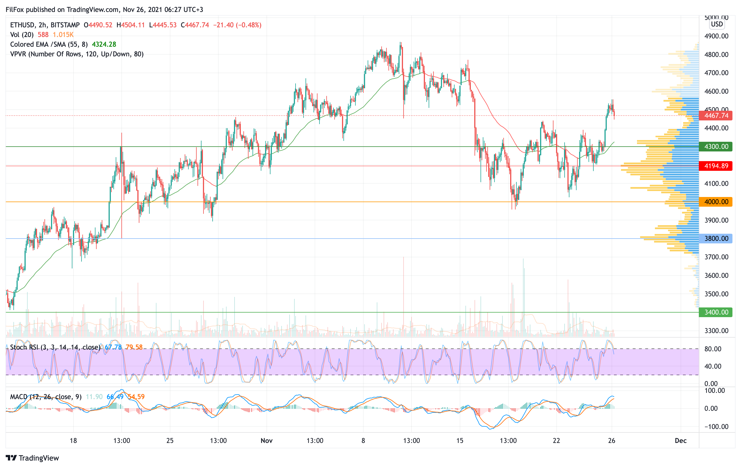 Вчера цена Ethereum уверенно восстановилась в область 4500.00 USD, а к завершению дня обозначила дневной максимум в районе отметки 4556.00 USD.