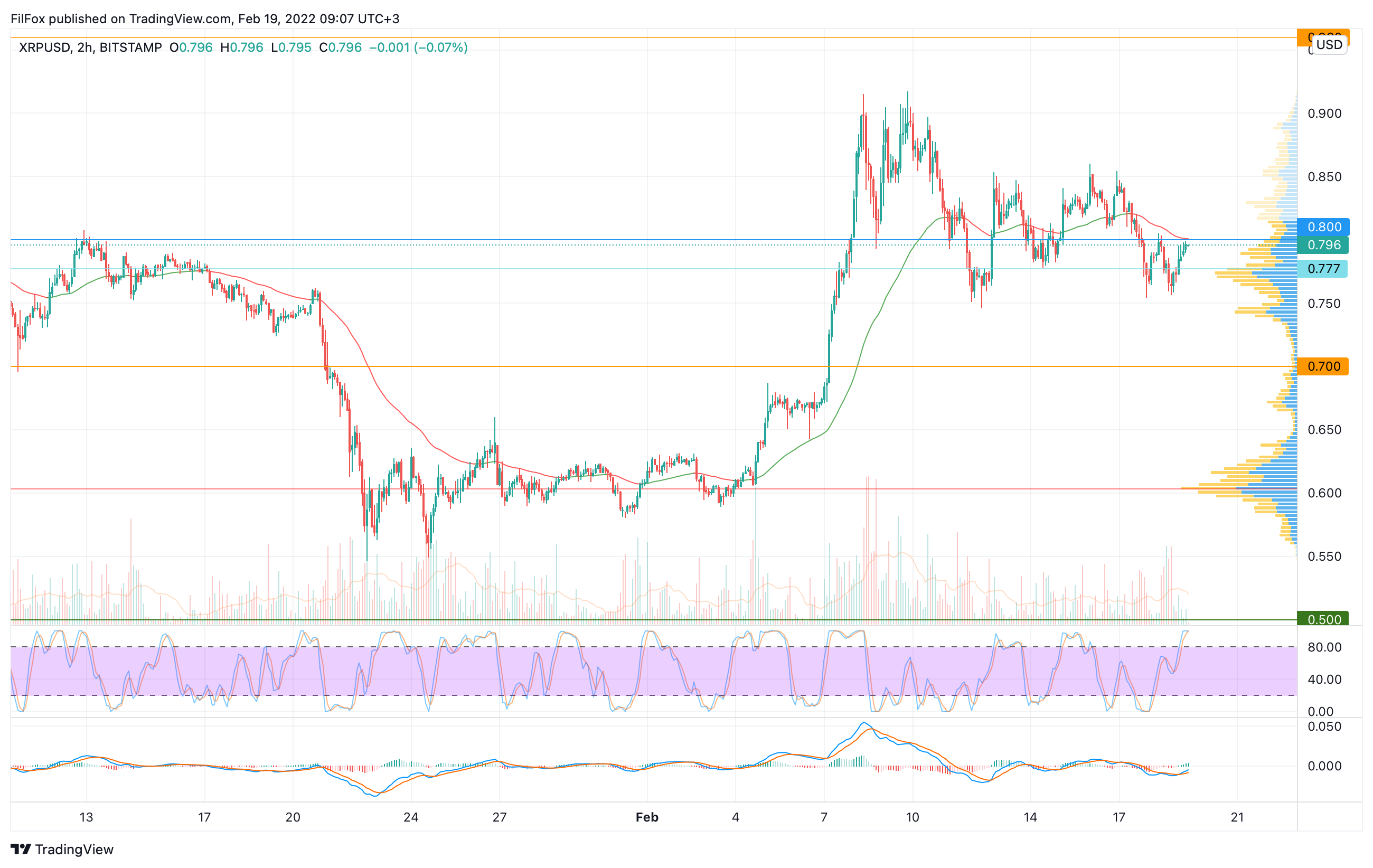 Вчера продавцы прорвали слабую поддержку 0.777 USD, но существенно оттеснить цену XRP у них так и не получилось.