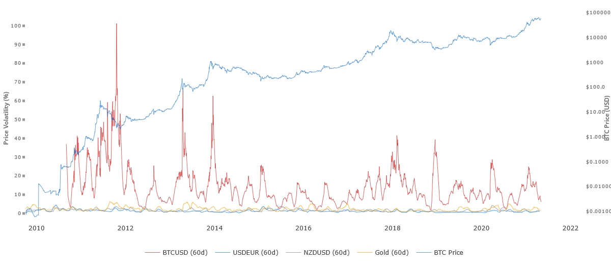 Согласно графику Woobull, 60-дневная волатильность биткоина снижается с начала 2021 года. Тем не менее, графики AlphaQuery показывают, что цена акций Tesla и Apple за этот же период показывает меньшую волатильность.