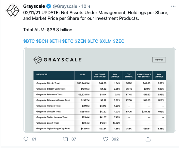 Инвестиционные фонды Grayscale привлекли значительное внимание крупных инвесторов, стремящихся получить доступ к криптовалютам с помощью традиционных средств. Grayscale де-факто остается лидером в этой сфере с совокупными активами в 36 миллиардов долларов. В текущих доверительных фондах Grayscale доминирует биткоин (BTC), который составляет около 82% от общей суммы.