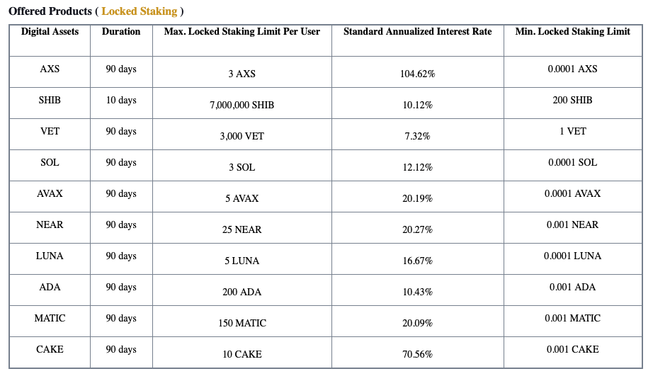 Согласно сообщению в блоге торговой платформы, инициатива по стейкингу, получившая название High-Yield Center, позволит блокировать 10 монет и зарабатывать до 104,62% годовых.