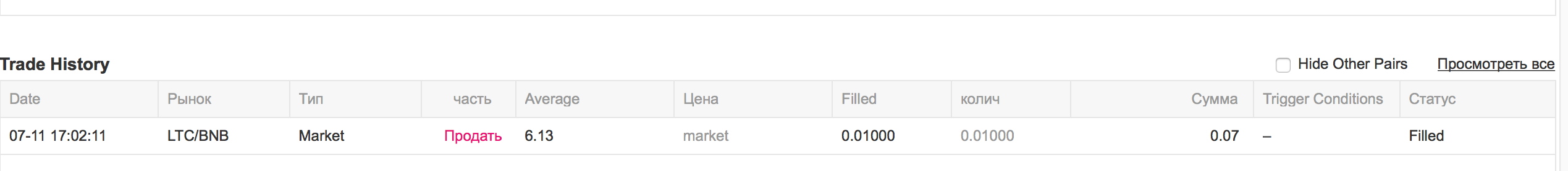 В этом окне отображается информация, что 11 июля была совершена сделка по торговой паре LTC/BNB. Тип сделки «Market». Был продан криптоактив LTC по курсу 6.13 в объёме 0.01 (подтверждена сделка на 0.01). Сумма которую мы приобрели 0.07 BNB.
